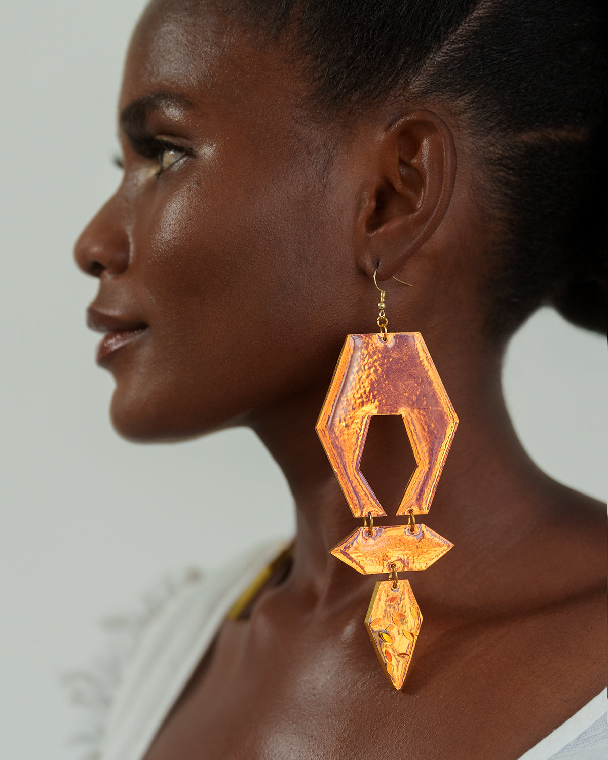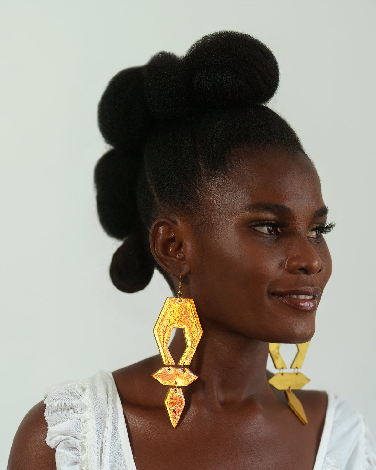 These earrings were inspired by earth's natural elements. These pieces are cut into both organic and geometric shapes. The base is covered in a reflective two tone gold .The outside layer is coated with a high gloss resin giving the piece a 3D effect.